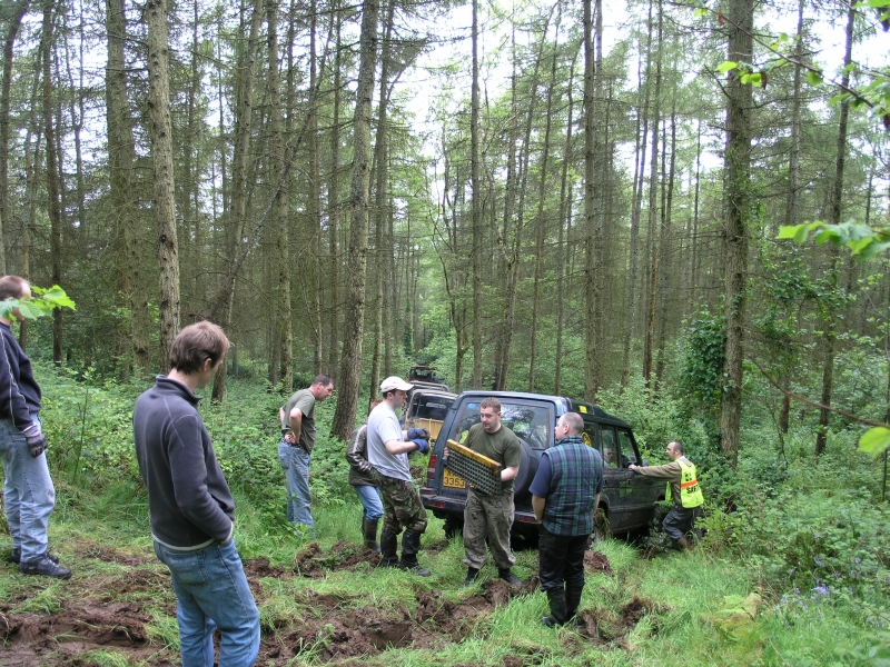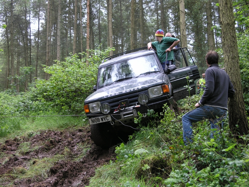 A little further down the hill the going was firmer (mostly) but there were some rather nasty tree stumps in the way from old fellings by the forestry workers. I was the passenger in this Discovery when it came to a halt going through an awkward bit. We bailed out for a look but it was difficult to see the problem because of the rough ground so the winch was tried to haul the motor off whatever was holding it.