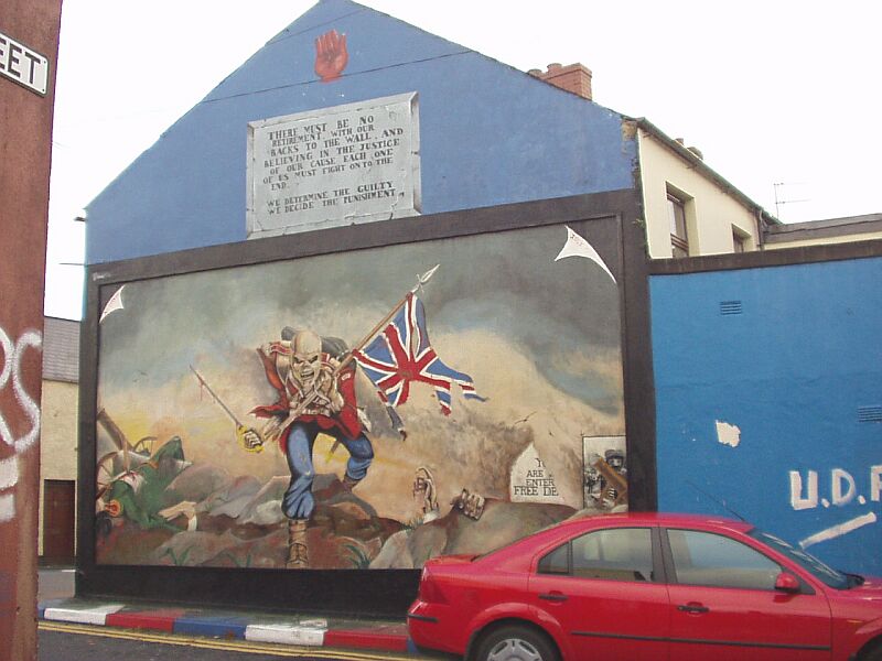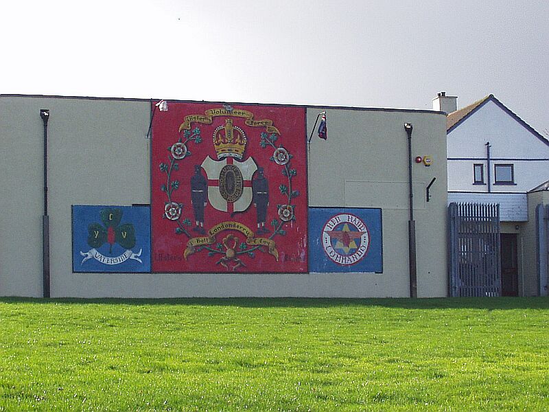 More loyalist insignia, this time on the wall of the community centre in the Irish St estate. It is interesting that in this and other such paintings the valiant fighting men are still depicted wearing masks. Says something, I think, about the attitudes these people have to their own behaviour! Anti-social and proud of it perhaps?